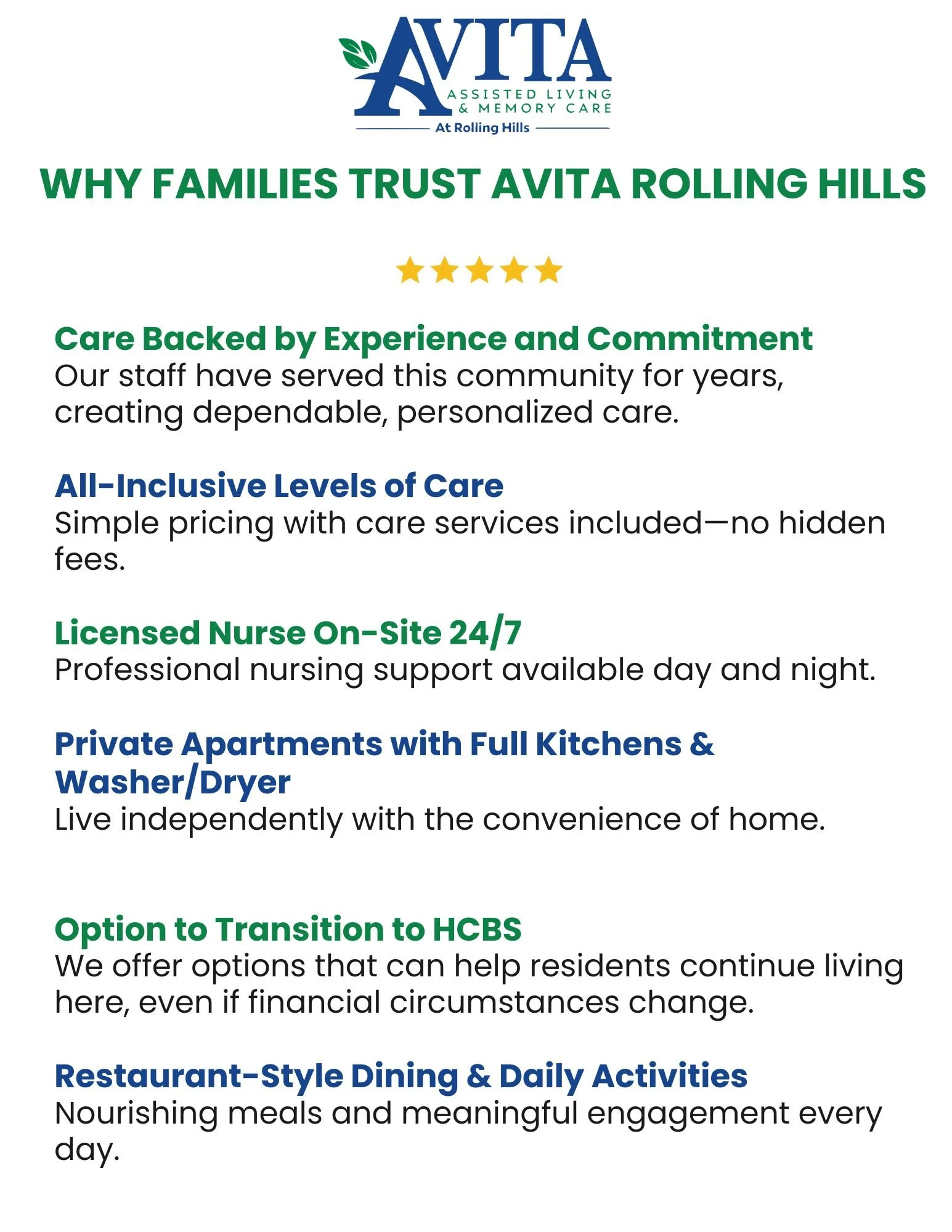Avita Rolling Hills, an award-winning campus opened in 2012 in West Wichita, Kansas, is a state-of-the-art assisted living and memory care community. Located on a senior campus alongside skilled nursing, dialysis, and Home Plus facilities, we provide the highest quality care and services to our residents.